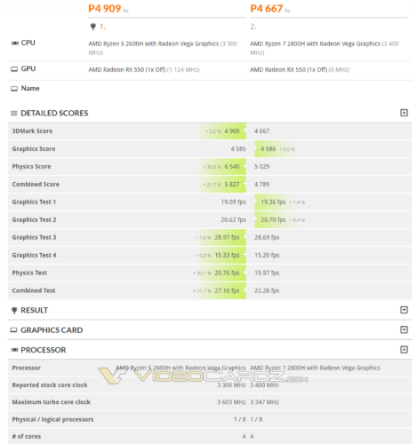 A few weeks ago, some 3D Mark benchmark results for the Ryzen 7 2800H and Ryzen 5 2600H surfaced (via Videocardz.com). This is a new AMD APU in the ‘H’ family – a series of high-performance processor for laptops. Neither the benchmark result nor the processor itself has been acknowledged by AMD, but it appears to be legit considering the hardware verification software in Futuremark’s 3DMark.
