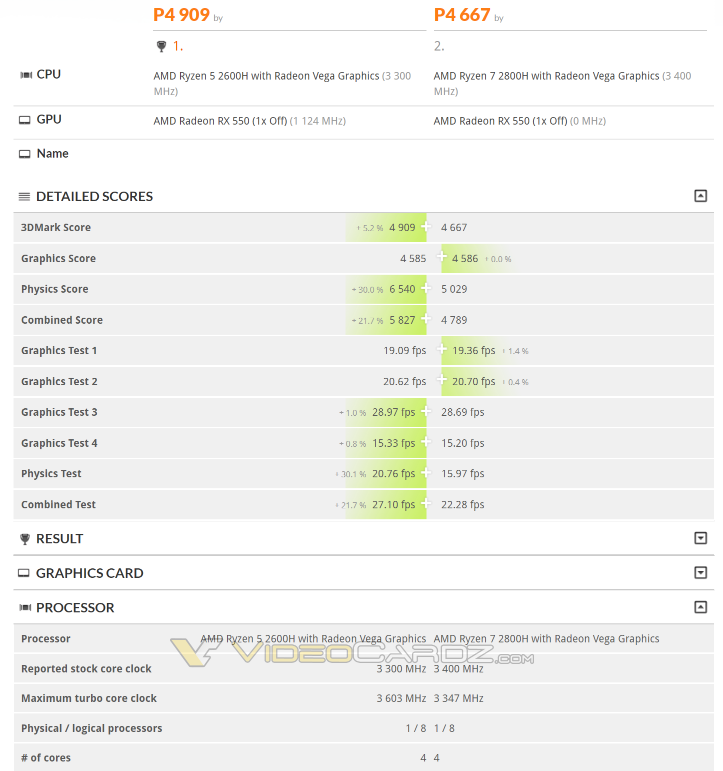 Interestingly, the Ryzen 5 2600H performs better on average compared to the presumably more expensive Ryzen 7. A quick look at the detailed processor information provides a hint, in the form of a lower, perhaps thermally restricted, maximum turbo core clock for the Ryzen 7 CPU. And unfortunately, we still have no idea what the exact specifications are, but both CPUs appear to be 4-core/8-thread models.