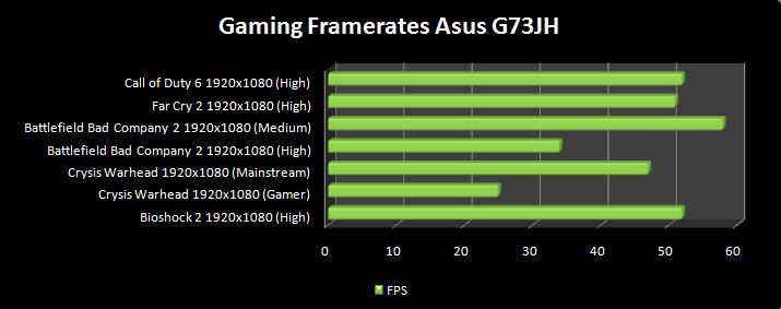 It’s not very hard to summarize how the Asus G73JH performs in games. In short, everything runs at the screen’s native (1920×1080) resolution, and there’s rarely any need to tune down the detail settings or even anti-aliasing. The only game where the G73JH went below the magical 30fps barrier was Crysis Warhead – still uncontested when it comes to torturing graphics cards. However, lowering the detail settings to “Mainstream” (medium equivalent) nearly doubles the frame rate.