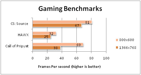 HAWX is the only game you don’t want to play with this laptop as it is the most demanding, while Stalker: Call of Pripyat is still playable even if it is newer than HAWX. Remember that we tested all these three games in lowest graphical details. Setting any game to “Medium” will definitely lower the score and cause the game to become unplayable.